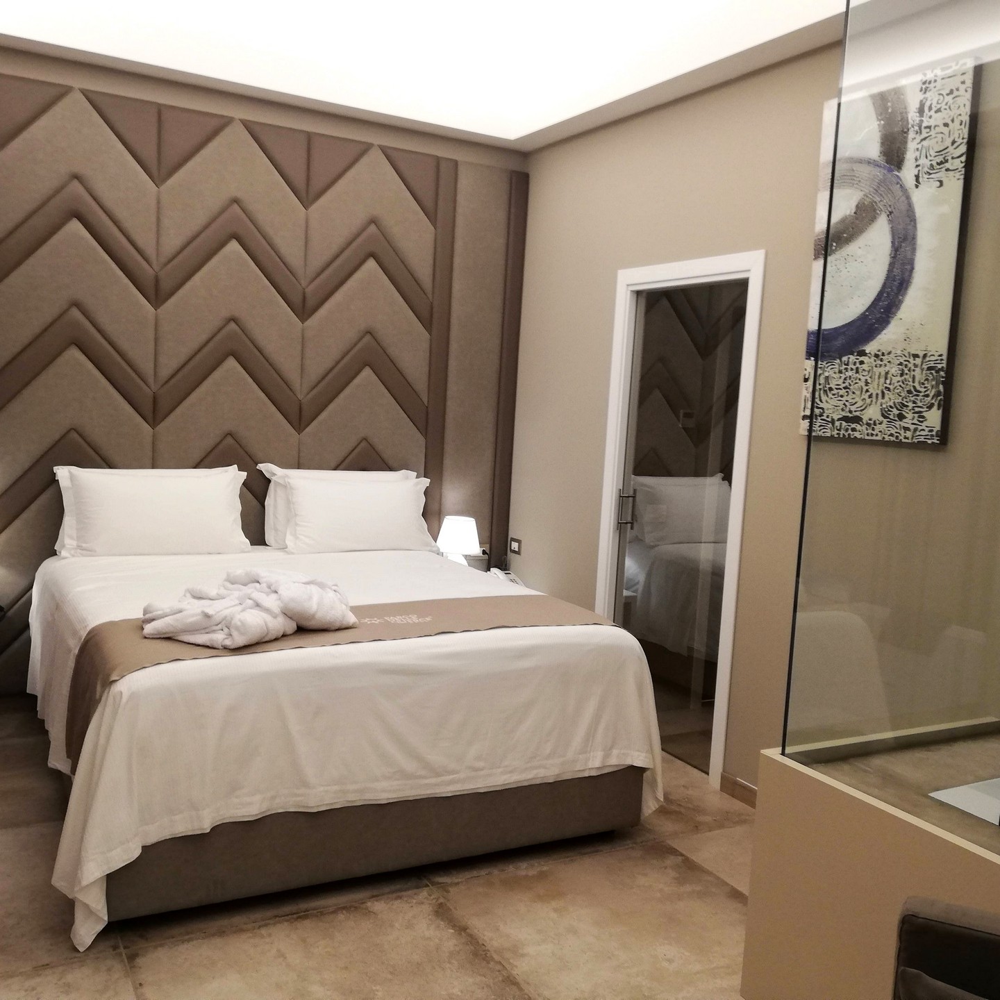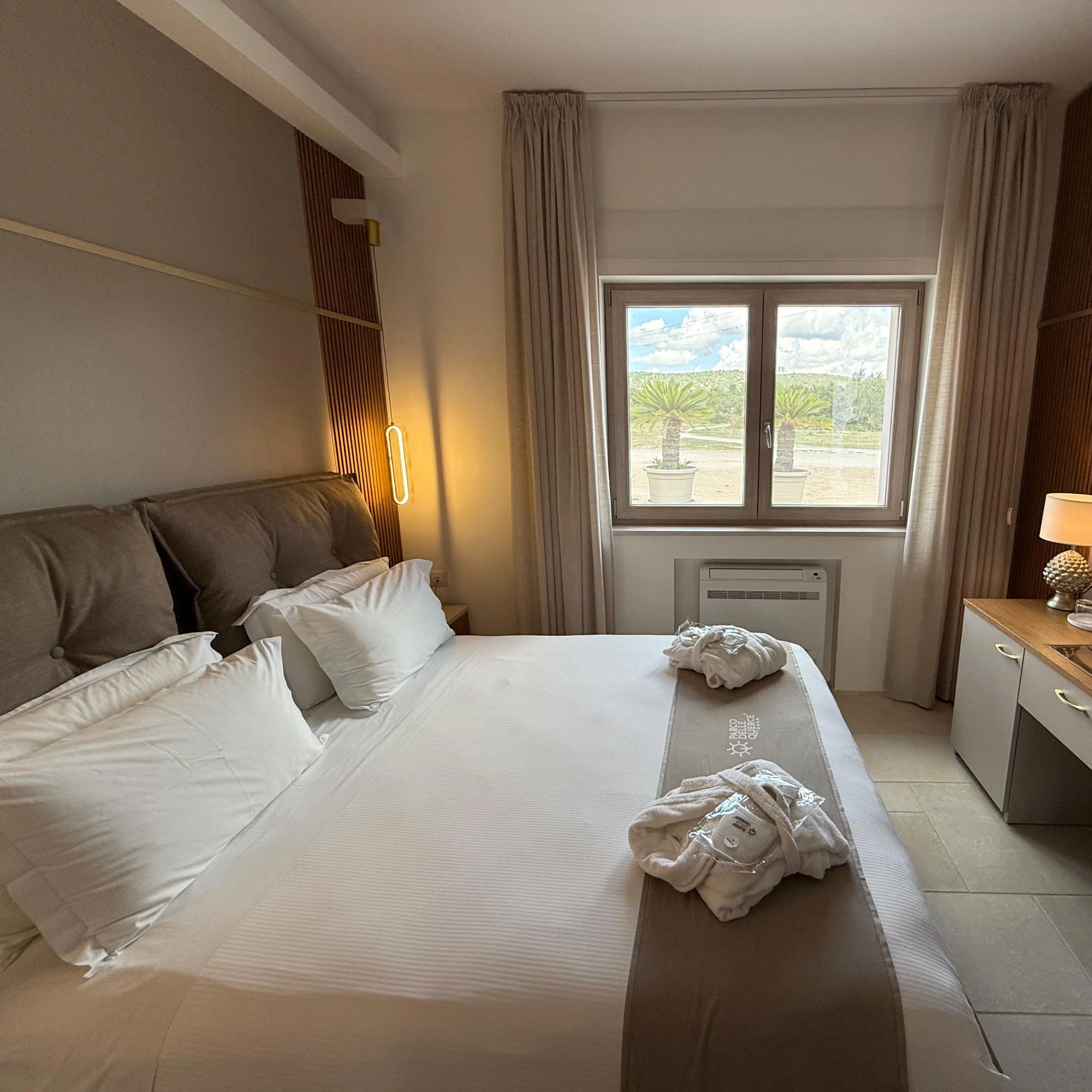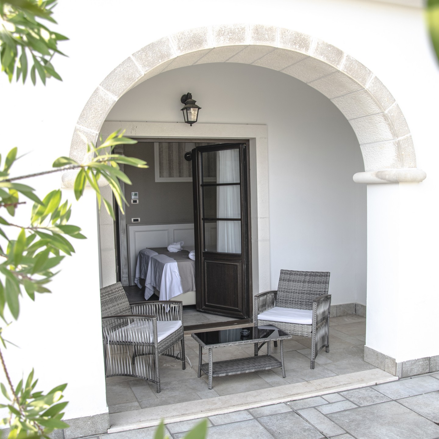 Le stanze sono tutte sullo stesso livello del patio interno dell’Hotel disposte tipo chiostro monacale, dove al centro è posizionato un giardino ed una piscina privata ad uso esclusivo degli ospiti.